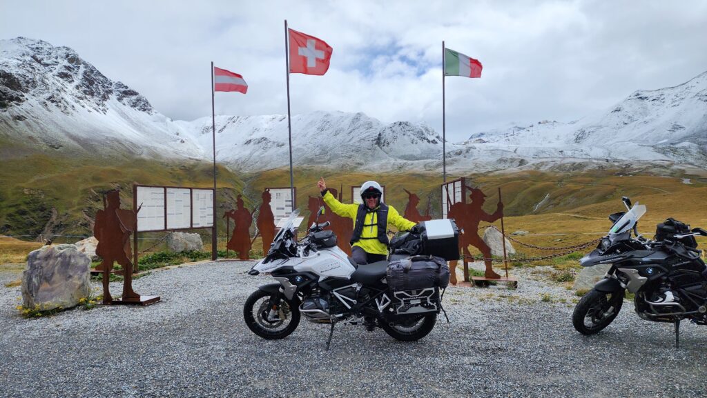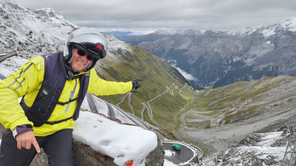 Llegamos al Paso dello Stelvio con el pavimento mojado, con nieve, y fuimos afortunados, ya que un par de días después, el paso sería imposible para las motos. Como lo soñamos, llegar al punto más alto del Passo dello Stelvio es una maravilla, ya que permite ver desde arriba su espectacular carretera, que comienza con una secuencia de caracoles para luego descender por la ladera de la montaña como quien lanza trazos grises sobre un lienzo verde.