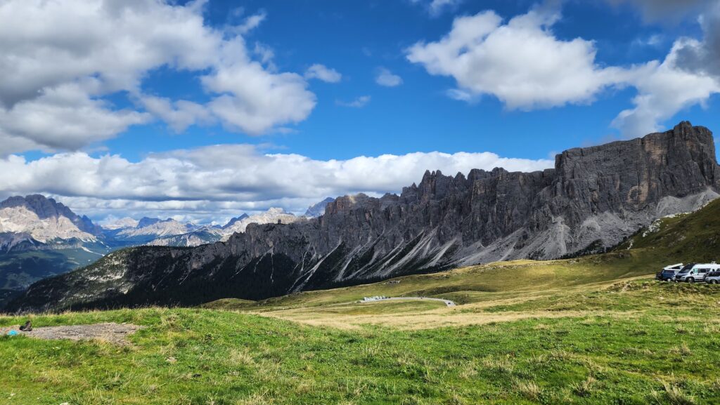Finalmente, llegamos a Las Dolomitas, y debo ser honesto: no tenía ni idea de a lo que venía. Sabía, claro, que eran muy famosas entre los moteros y tal, pero lejos estábamos de imaginar la belleza de esa zona. Las Dolomitas son un conjunto de macizos montañosos en los Alpes orientales italianos. Es una de las zonas naturales más reconocidas de los Alpes, que alberga un parque nacional y nueve parques naturales. La verdad, quedamos impactados. Recorrer Las Dolomitas es, en verdad, increíble. Combina carreteras con infinitas curvas, con unas vistas estelares de montañas marmóreas impresionantes. Da lo mismo si miras a la izquierda o a la derecha del camino: las vistas son preciosas. Fuimos a Cinque Torri, La Cortina d’Ampezzo, el Paso Giau, el Paso Pordoi y el pueblito de Alleghe.