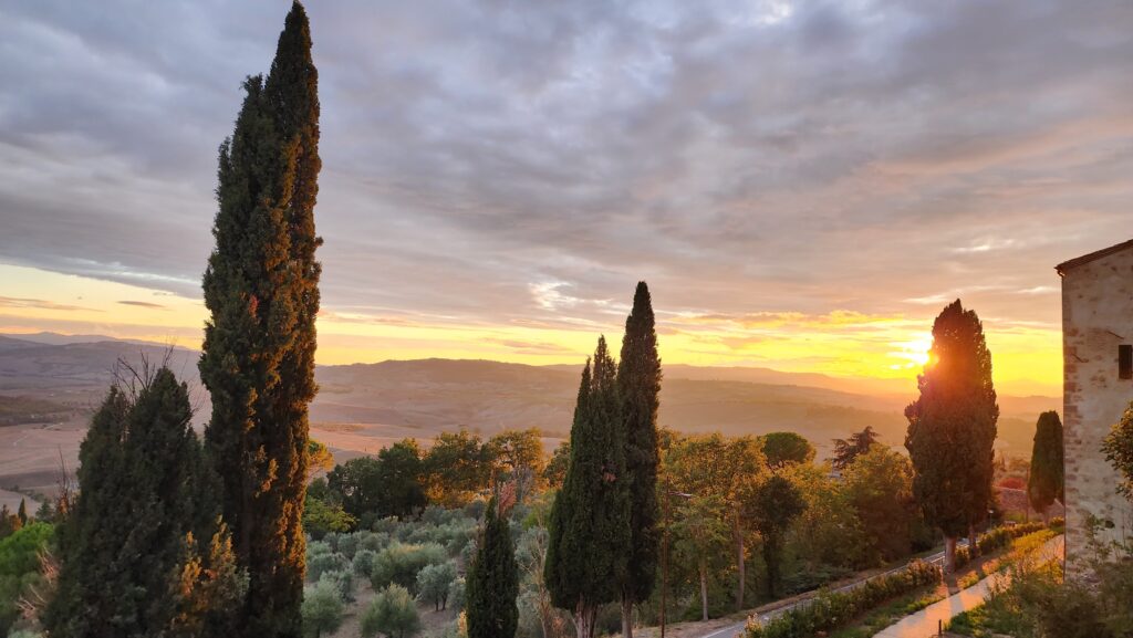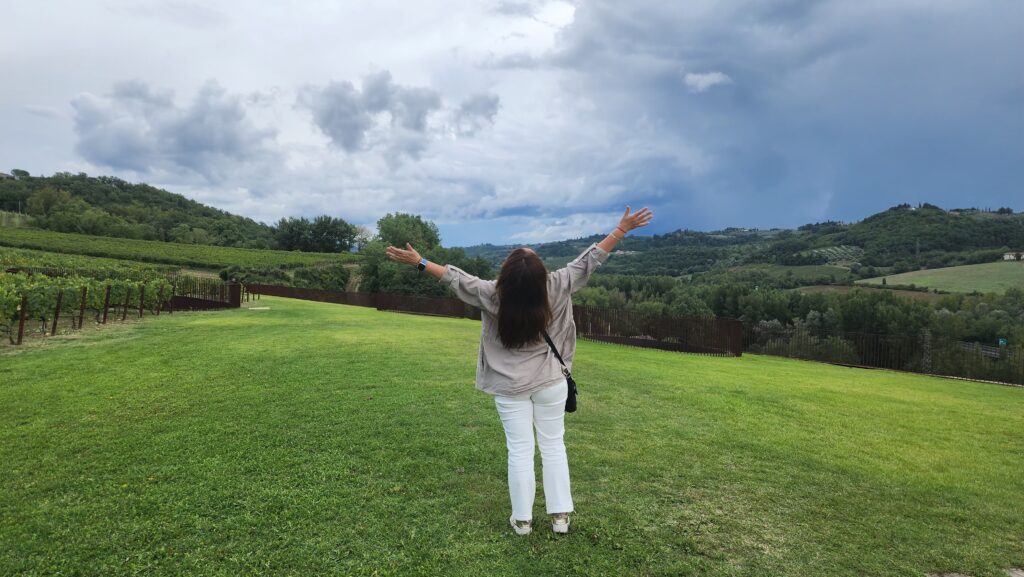 Una de esas tardes soleadas terminó en un anochecer lluvioso que pasamos haciendo un picnic en el jardín del Castello di Gabiano, con una botella de Chianti Classico Riserva de sus bodegas, comiendo prosciutto, queso pecorino con pistacho, pan y miel, escuchando canciones de Andrea Bocelli, y todo maridado con una vista preciosa de la Toscana, esta vez bajo la lluvia. Fue una noche mágica, de emociones a flor de piel.