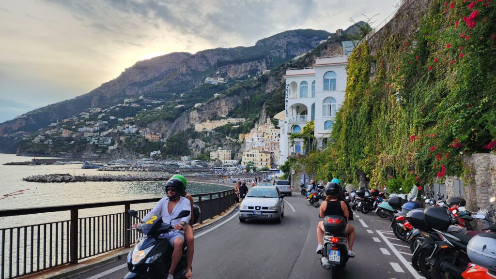 La Costa Amalfitana es preciosa pero sus playas, resultado de acantilados bruscos y escarpados, distan mucho de las playas largas de arena suave del caribe, a las que estoy acostumbrado. Capri es una perla rodeada de una mar turquesa intenso. Un imperdible. Ya de salida, volvimos a hacer la ruta de la costa Amalfitana una vez más, pero esta vez en nuestras motos. El tráfico hizo este tramo mucho más lento, ya que adelantar con estas motos es mucho más difícil que en scooter. Después de Maiori ya la ruta a Salerno fue más fluida y nos dio la oportunidad de disfrutarla con más soltura.
