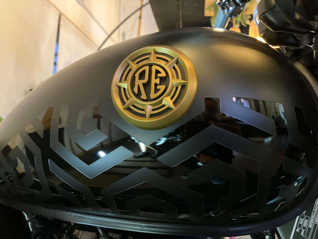 El depósito de combustible de la Royal Enfield Goan Classic 350 luce todo el diseño de la casa fundada en Inglaterra en 1901, pero controlada por capitales indios desde mediados del siglo XX. Las alternativas en la gama de colores son Trip Teal, Rave Red, Purple Haze y Shack Black.